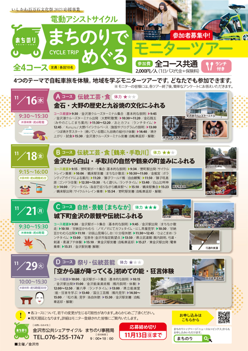 この度「いしかわ百万石文化祭2023応援事業」として金沢市主催の電動アシストサイクルまちのりでめぐるモニターツアーを開催いたします!