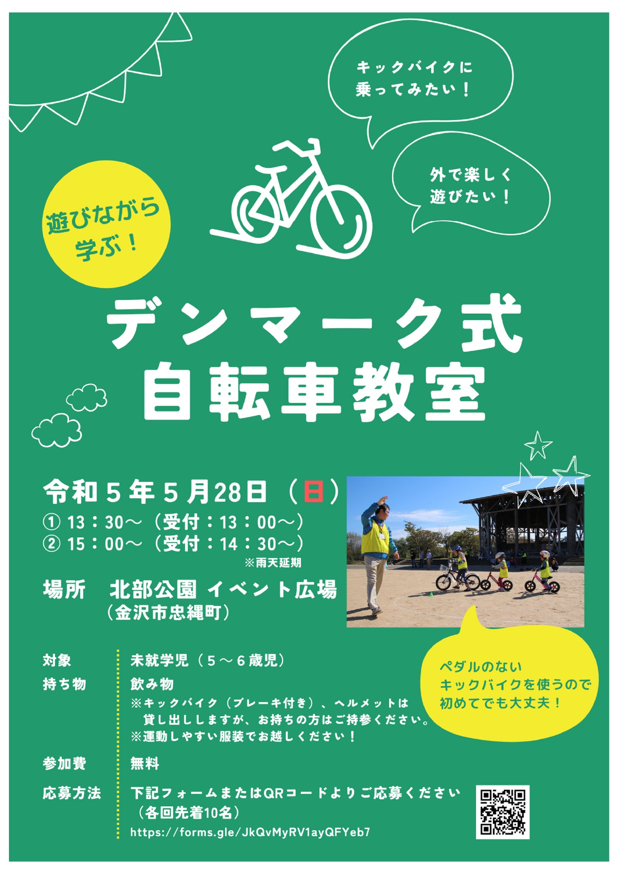 幼少期から自転車に触れ、親しむ機会を作ることで、 将来的な自転車利用促進やサイクリストの増加につながることができると思いますので 是非協会の皆様も講習会の受講や教室の現場をご覧いただけますと幸いです。 参加ご希望の方はチラシQRコード、応募フォームよりお申し込みください。