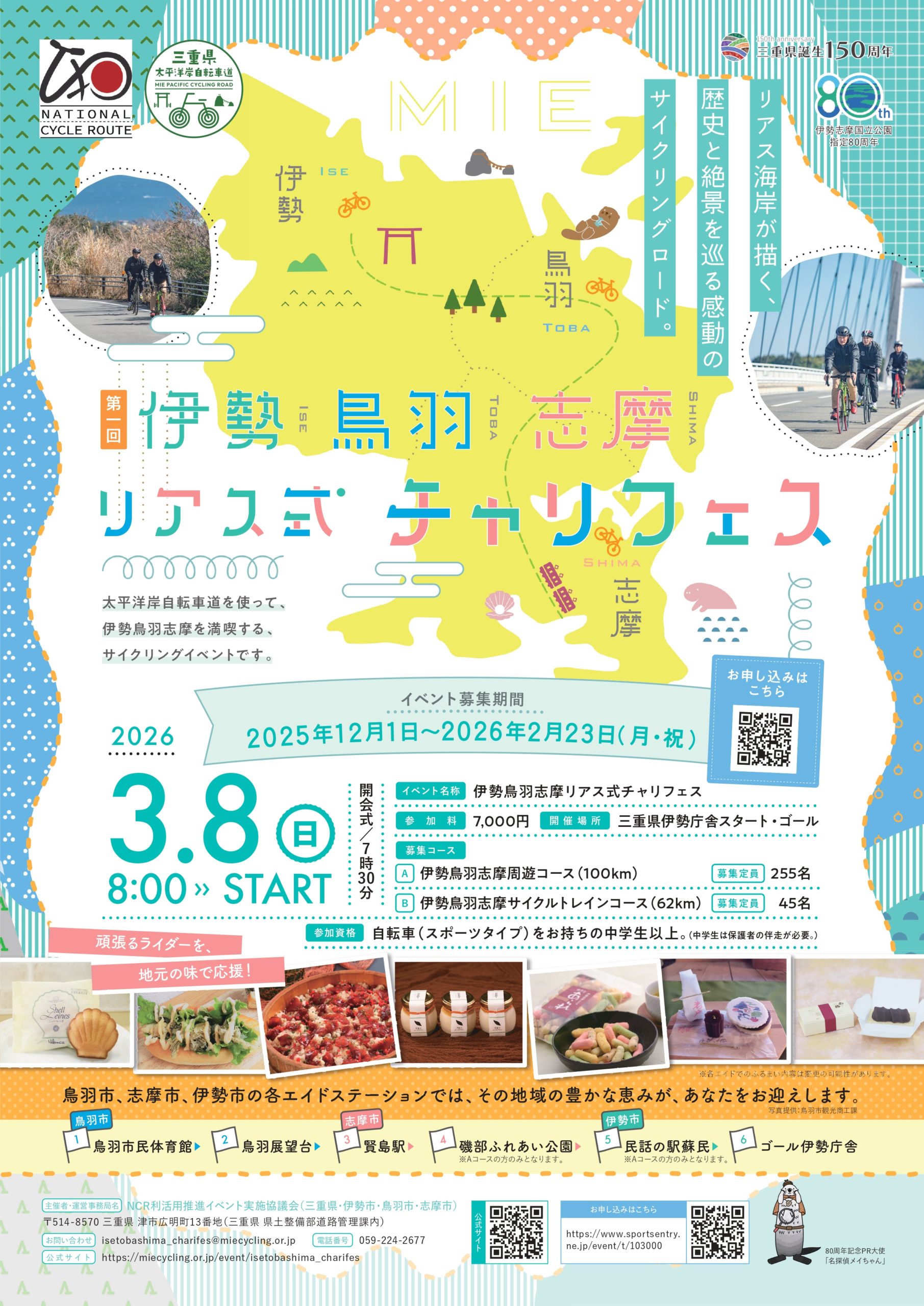 太平洋岸自転車道(ナショナルサイクルルート)を活用したサイクリングイベント。伊勢・鳥羽・志摩のリアス式海岸沿いを走り、地元グルメを楽しむ。第1回開催で、初心者から上級者向けの2コースを設定。小雨決行。